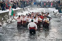 In the town of Kalofer, a traditional horo with drums and bagpipes is played in the icy waters of the Tundzha river before the throwing of the cross.[76][77]