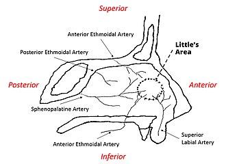 The vast majority of nosebleeds occur in the front anterior (front) part of the nose from the nasal septum. This area is richly endowed with blood vessels (Kiesselbach's plexus). This region is also known as Little's area. Bleeding farther back in the nose is known as a posterior bleed and is usually due to bleeding from Woodruff's plexus, a venous plexus situated in the posterior part of inferior meatus.[16] Posterior bleeds are often prolonged and difficult to control. They can be associated with bleeding from both nostrils and with a greater flow of blood into the mouth.[14]
