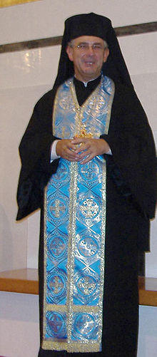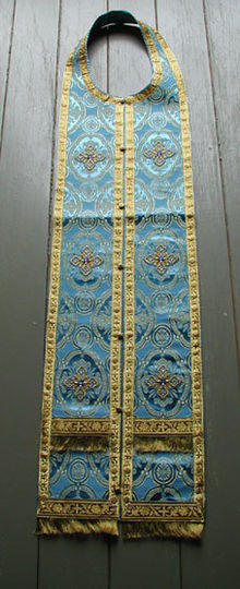 The epitrachelion (Greek: ἐπιτραχήλιον "around the neck"; Slavic: епитрахиль, epitrachil; often called simply a stole in casual English-language usage) is the liturgical vestment worn by priests and bishops of the Orthodox Church and Eastern Catholic Churches as the symbol of their priesthood, corresponding to the Western stole. It is essentially the orarion adapted for priests and bishops, worn around the neck with two ends of equal length hanging down in front of the clergyman's body (more or less to the ankle) and with the two adjacent sides sewn or buttoned together up the center, leaving enough space through which to place the head. In practice, the epitrachelion is made to be worn only this way, tailored to lie flat around the neck, and is never actually unfastened. The portion hanging down in front is sometimes even a solid piece of fabric. It is usually made of brocade with seven embroidered or appliquéd crosses, one at the back of the neck and three down each side.[1] The epitrachelion is the only required vestment whenever a priest is conducting an Orthodox service; without it, he is unable to perform the service.