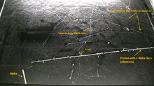 A delta ray is characterized by very fast electrons produced in quantity by alpha particles or other fast energetic charged particles knocking orbiting electrons out of atoms. Collectively, these electrons are defined as delta radiation when they have sufficient energy to ionize further atoms through subsequent interactions on their own. Delta rays appear as branches in the main track of a cloud chamber (See Figs. 1,2). These branches will appear nearer the start of the track of a heavy charged particle, where more energy is imparted to the ionized electrons.