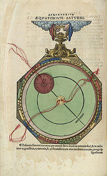The earliest extant record of a solar equatorium, that is, one to find the position of the sun, is found in Proclus's fifth-century work Hypostasis,[1] where he gives instructions on how to construct one in wood or bronze.[2] Although planetary equatoria were also probably made by the ancient Greeks,[2] the first surviving description of one is from the Libros del saber de astronomia (Books of the knowledge of astronomy), a Castilian compilation of astronomical works collected under the patronage of Alfonso X of Castile in the thirteenth century, which includes translations of two eleventh century Arabic texts on equatoria by Ibn al‐Samḥ and al-Zarqālī.[2] Theorica Planetarum (c. 1261-1264) by Campanus of Novara describes the construction of an equatorium, the earliest known description in Latin Europe.[3]