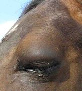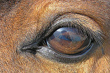The equine eye is one of the largest of any land mammal.[1] Its visual abilities are directly related to the animal's behavior; for example, it is active during both day and night, and it is a prey animal. Both the strengths and weaknesses of the horse's visual abilities should be taken into consideration when training the animal, as an understanding of the horse's eye can help to discover why the animal behaves the way it does in various situations.