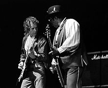 Organist Eric Wrixon left Thin Lizzy after a few months, and the remaining trio later secured a contract with Decca Records.[5] As lead guitarist, Bell played on Thin Lizzy's first three albums Thin Lizzy, Shades of a Blue Orphanage and Vagabonds of the Western World, as well as their hit single "Whiskey in the Jar". He co-wrote a number of songs with Lynott and Downey, including "The Rocker" which became a live favourite throughout the band's career.[2] He also composed one song on his own, "Ray Gun", from their first album, Thin Lizzy.[6]