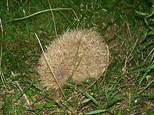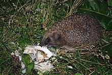 Eurasian eagle-owls (Bubo bubo) and golden eagles (Aquila chrysaetos) are the only regular avian predators of this species and may even prefer them as prey. The owl, after grabbing the hedgehog by its face, tends to skin the mammal's prickly back with its talons before consumption, resulting in several hedgehog backs being found around eagle-owl roosts and nests.[13] In Spain, reduction of European rabbit (Oryctolagus cuniculus) numbers due to rabbit haemorrhagic disease has made the European hedgehog one of the top preferred prey species for eagle-owls.[14] Elsewhere, eagle-owls often prefer these hedgehogs to any other prey species, as the hedgehog can comprise up to 23% by number and 30.7% by biomass of eagle-owl prey remains.[15][16][17] On the Swedish island of Gotland the golden eagle may take larger numbers of hedgehogs than any other prey due to an otherwise low diversity of native land mammals, although the introduction of European rabbits has shifted the eagle's prey preferences there.[18]