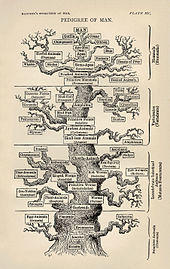 Haeckel divided human beings into ten races, of which the Caucasian was the highest and the primitives were doomed to extinction.[35] In his view, 'Negroes' were savages and Whites were the most civilised: for instance, he claimed that '[t]he Negro' had stronger and more freely movable toes than any other race, which, he argued, was evidence of their being less evolved, and which led him to compare them to '"four-handed" Apes'.[36]