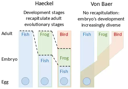 When Haeckel was a student in the 1850s he showed great interest in embryology, attending the rather unpopular lectures twice and in his notes sketched the visual aids: textbooks had few illustrations, and large format plates were used to show students how to see the tiny forms under a reflecting microscope, with the translucent tissues seen against a black background. Developmental series were used to show stages within a species, but inconsistent views and stages made it even more difficult to compare different species. It was agreed by all European evolutionists that all vertebrates looked very similar at an early stage, in what was thought of as a common ideal type, but there was a continuing debate from the 1820s between the Romantic recapitulation theory that human embryos developed through stages of the forms of all the major groups of adult animals, literally manifesting a sequence of organisms on a linear chain of being, and Karl Ernst von Baer's opposing view, stated in von Baer's laws of embryology, that the early general forms diverged into four major groups of specialised forms without ever resembling the adult of another species, showing affinity to an archetype but no relation to other types or any transmutation of species. By the time Haeckel was teaching he was able to use a textbook with woodcut illustrations written by his own teacher Albert von Kölliker, which purported to explain human development while also using other mammalian embryos to claim a coherent sequence. Despite the significance to ideas of transformism, this was not really polite enough for the new popular science writing, and was a matter for medical institutions and for experts who could make their own comparisons.[46]:264–267[47]