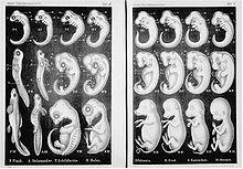 Haeckel advanced a version of the earlier recapitulation theory previously set out by Étienne Serres in the 1820s and supported by followers of Étienne Geoffroy Saint-Hilaire including Robert Edmond Grant.[26] It proposed a link between ontogeny (development of form) and phylogeny (evolutionary descent), summed up by Haeckel in the phrase "ontogeny recapitulates phylogeny". His concept of recapitulation has been refuted in the form he gave it (now called "strong recapitulation"), in favour of the ideas first advanced by Karl Ernst von Baer. The strong recapitulation hypothesis views ontogeny as repeating forms of adult ancestors, while weak recapitulation means that what is repeated (and built upon) is the ancestral embryonic development process.[27] Haeckel supported the theory with embryo drawings that have since been shown to be oversimplified and in part inaccurate, and the theory is now considered an oversimplification of quite complicated relationships, however comparison of embryos[6] remains a powerful way to demonstrate that all animals are related. Haeckel introduced the concept of heterochrony, the change in timing of embryonic development over the course of evolution.[28][29]
