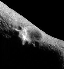 - ^ A composite image of the north polar region, with the craters Psyche above and Himeros below. The long ridge Hinks Dorsum, believed to be a thrust fault, can be seen snaking diagonally between them. The smaller crater in the foreground is Narcissus (Watters, 2011)