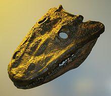 Eryops /ˈɛri.ɒps/ meaning "drawn-out face" because most of its skull was in front of its eyes (Greek ἐρύειν, eryein = drawn-out + ὤψ, ops = face) is a genus of extinct, amphibious temnospondyls. It contains the single species Eryops megacephalus, the fossils of which are found mainly in early Permian (about 295 million years ago) rocks of the Texas Red Beds, located in Archer County, Texas. Fossils have also been found in late Carboniferous period rocks from New Mexico. Several complete skeletons of Eryops have been found in lower Permian rocks, but skull bones and teeth are its most common fossils.