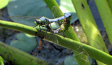 The eastern pondhawk is an athletic, swift-flying predator, able to catch damselflies and other insect prey on the wing. In between hunts it rests on vegetation, ready to take to the air if prey comes within sight.[2] When newly emerged, the dragonflies at first hunt away from water. After about two weeks they return to the ponds and males set up territories, chasing away rivals. The males guard the floating algal mats that make suitable egg-laying sites. Satellite males remain nearby, awaiting an opportunity to intercept females or seize territories.[4]