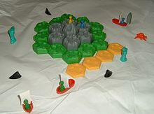 The centre of the game's board, representing the mountainous island of Atlantis itself, is covered with several tiers of molded hexagon tiles (37 in total) giving the game a partly three-dimensional appearance. The island is made up of four different "rings", with a mountain peak at the centre, a ring of mountains around it, a ring of forest around that, and finally a ring of sandy beach at the outer edge. Each of the tiles has space to hold a maximum of 3 Atlanteans.