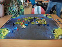 Each player sets his/her tribe up on the island, in places of his/her own choosing. The only limitation is that sandy beach tiles can start with only one villager per tile.