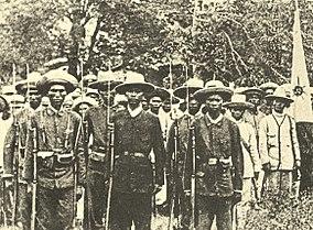 Soldiers and mercenaries trained in the Philippines which were recruited by France which was then in an alliance with Spain, had fought in Cambodia and Vietnam justified by defending newly converted Catholic populations from persecutions and had assisted France in establishing French Cochinchina centered in Saigon.[54] Also in Asia, at China, during the Taiping Rebellion, Filipinos who were described as Manilamen and were ‘Reputed to be brave and fierce fighters’ and ‘were plentiful in Shanghai and always eager for action’ were employed by the Foreign forces as mercenaries to successfully quell the Taiping Rebellion.[55][56][57][58] In the opposite side of the world at the Americas, descendants of Filipinos were active in the Anti-Imperialist Wars in the Americas. Filipinos living in Louisiana at the independent settlement of Saint Malo were recruited to be soldiers commanded by Jean Lafayette in the defense of New Orleans during the War of 1812 against a Britain attempting to reconquer a rebel America.[59] "Manilamen" recruited from San Blas together with the Argentinian of French descent, Hypolite Bouchard, joined other nationalities living nearby such as Frenchmen, Mexicans and Americans in the assault of Spanish California during the Argentinian War of Independence.[60][61] Mexicans of Filipino descent being led by Filipino-Mexican General Isidoro Montes de Oca assisted Vicente Guerrero in the Mexican war of independence against Spain. Isidoro Montes de Oca was a celebrated war hero famous for the battle action of the Treasury of Tamo, in Michoacán on September 15, 1818, in which the opposing forces numbered four times greater, yet they were totally destroyed.[62]