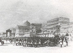 The street named Esplanade Row, finds a mention in the map of 1784, running from Dhurmotollah right on to the banks of the river at Chandpal Ghat, passing on its way Government House and Council House, both facing south. Subsequently, it was divided by the gardens of Government House into two parts, Esplanade Row (East) and Esplanade Row (West).[1] Esplanade Row (West) now runs between Government Place (West) and Strand Road, through the Kolkata High Court. Esplanade Row (East) has been renamed Sidhu Kanu Dahar and occupies the northern end of the Maidan.[4]