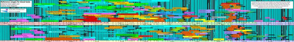 Minerals are present in a healthy human being's blood at certain mass and molar concentrations. The figure below presents the concentrations of each of the chemical elements discussed in this article, from center-right to the right. Depending on the concentrations, some are in upper part of the picture, while others are in the lower part. The figure includes the relative values of other constituents of blood such as hormones. In the figure, minerals are color highlighted in purple.