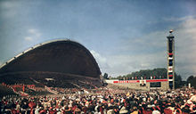 Starting from 1947, the Soviet authorities forced foreign songs into the repertoire. Every event was to include the State Anthem of the Estonian SSR, The Internationale, and the State Anthem of the Soviet Union.[1] Because of the inclusion of children's and boys' choirs the total number of participants rose to 25,000 – 30,000 people. The Dance and Gymnastic Festival of the First Estonian Games started in 1934 became predecessors of later National Dance Festivals accompanying the song festival.[5]