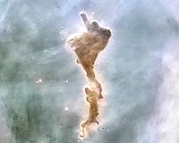 A small Bok globule in the Keyhole Nebula has been photographed by the Hubble Space Telescope and is nicknamed the "Carina Defiant Finger" due to its shape.[24] In Hubble images, light can be seen radiating off the edges of the globule; this is especially visible in the southern tip, where the "finger" is. It is thought that the Defiant Finger is being ionized by the bright Wolf–Rayet star WR 25, and/or Trumpler 16-244, a bright blue supergiant. It has a mass of at least 6 M☉, and stars may be forming within it. Like other interstellar clouds under intense radiation, the Defiant Finger will eventually be completely evaporated; for this cloud the time frame is predicted to be 200,000 to 1,000,000 years.[25]