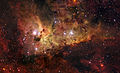 The Carina Nebula[7] or Eta Carinae Nebula[8] (catalogued as NGC 3372; also known as the Grand Nebula, Great Carina Nebula[9]) is a large, complex area of bright and dark nebulosity in the constellation Carina, and is located in the Carina–Sagittarius Arm. The nebula is approximately 8,500 light-years (2,600 pc) from Earth.