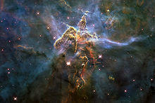 Mystic Mountain is the term for a dust–gas pillar in the Carina Nebula, a photo of which was taken by Hubble Space Telescope on its 20th anniversary. The area was observed by Hubble's Wide Field Camera 3 on 1–2 February 2010. The pillar measures three light-years (0.92 pc) in height; nascent stars inside the pillar fire off gas jets, that stream from towering peaks.