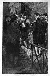 Allen was first placed aboard HMS Gaspée, a brig anchored at Montreal. He was kept in solitary confinement and chains, and General Richard Prescott had, according to Allen, ordered him to be treated "with much severity".[84] In October 1775, the Gaspée went downriver, and her prisoners were transferred to the Adamant, which then sailed for England.[85] Allen wrote of the voyage that he "was put under the power of an English Merchant from London, whose name was Brook Watson: a man of malicious and cruel disposition".[86]