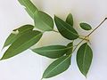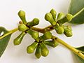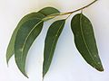 The adult leaves are stalked, broad-lanceolate, to 10 to 16 cm (3.9 to 6.3 in) long by 2–6 cm (0.79–2.36 in) wide, and are dark green above, and paler below.[7] Venation is fine and at 40° – 60° to the midline.[3] Developing from small cylindrical or club-shaped (clavate) buds,[7] the white flowers appear from January to April,[9] and are arranged in groups of six to eleven in umbellasters. The woody fruits, or gumnuts, are ovoid or cylindrical in shape, and measure between 7–12 mm long and 4–6 mm wide, with the valve near the rim or enclosed.[7][3] Seedlings and young plants have more ovate leaves which are arranged oppositely along the stems for the first three to six pairs until they assume the adult alternately arranged configuration. They are also paler on the undersurface, and measure 4.5 to 11 cm long and 1.3 to 5.5 cm wide.[2][3]