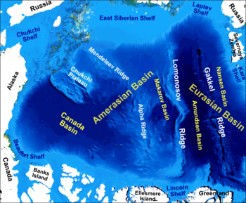 The Eurasia Basin is bounded by Greenland, the Lomonosov Ridge, and the shelves of the Laptev Sea, Kara Sea and Barents Sea. The maximum depth within the Eurasia Basin is reached at the Litke Deep with 5449 m depth.[1]