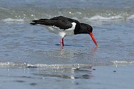 The oystercatcher is one of the largest waders in the region. It is 40–45 cm (16–18 in) long, the bill accounting for 8–9 cm (3–3 1&fras1;2 in), and has a wingspan of 80–85 cm (31–33 in).[4] They are obvious and noisy plover-like birds, with black and white plumage, red legs and strong broad red bills used for smashing or prising open molluscs such as mussels or for finding earthworms.[4] Despite its name, oysters do not form a large part of its diet. The bird still lives up to its name, as few if any other wading birds are capable of opening oysters at all.
