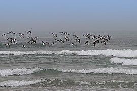 The oystercatcher is a migratory species over most of its range. The European population breeds mainly in northern Europe, but in winter the birds can be found in north Africa and southern parts of Europe. Although the species is present all year in Ireland, Great Britain and the adjacent European coasts, there is still migratory movement: the large flocks that are found in the estuaries of south-west England in winter mainly breed in northern England or Scotland. Similar movements are shown by the Asian populations. The birds are highly gregarious outside the breeding season.