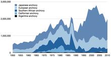 Local populations fluctuate, and have shown large fluctuations in the past.[1] These fluctuations are not well understood.[3] Some past declines have been due to environmental problems, local overfishing, and invasive species from ballast water. Mnemiopsis leidyi is an invasive species which eats European anchovy eggs.[1] Some past fluctuations are likely due to climate change.[5]
