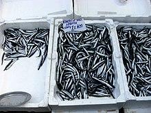 European anchovies are widely eaten.[1] Anchovies are considered an oily fish; they have a salty, strong taste. Some people eat them raw.[5] European anchovies are sold fresh, dried, smoked, salted, in oil, frozen, canned, and processed into fishmeal and fish oil.[5][1] Their ease of preservation has made them a traditional item for long-distance trade.[5] Anchovies are also used as fishing bait.[1][8]