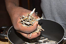 This species can be fished from the shore with simpler gear, such as beach seines,[1] and it has been widely-eaten for millennia.[2] has been fished since ancient times.[1] Both the species name, "engraulis", and the specific name "encrasicolus" are common names from Ancient Greek.[3][4]