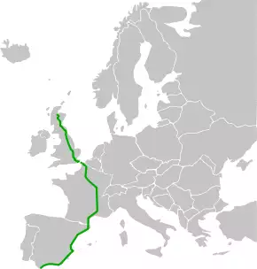 The European route E 15 is part of the United Nations international E-road network. It is a north-south "reference road", running from Inverness, Scotland south through England and France to Algeciras, Spain.[1] Along most of its route between Paris and London, the road parallels the LGV Nord (as the French A1 autoroute) and High Speed 1 (as the English M20 motorway). Its length is 2,300 miles (3,700 km).
