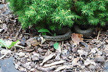 When attacked, the common toad adopts a characteristic stance, inflating its body and standing with its hindquarters raised and its head lowered. Its chief means of defence lies in the foul tasting secretion that is produced by its paratoid glands and other glands on its skin. This contains a toxin called bufagin and is enough to deter many predators although grass snakes seem to be unaffected by it.[15] Other predators of adult toads include hedgehogs, rats and mink, and even domestic cats.[22] Birds that feed on toads include herons, crows and birds of prey. Crows have been observed to puncture the skin with their beak and then peck out the animal's liver, thus avoiding the toxin.[22] The tadpoles also exude noxious substances which deter fishes from eating them but not the great crested newt. Aquatic invertebrates that feed on toad tadpoles include dragonfly larvae, diving beetles and water boatmen. These usually avoid the noxious secretion by puncturing the tadpole's skin and sucking out its juices.[22]