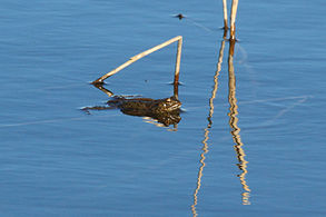 The common toad emerges from hibernation in spring and there is a mass migration towards the breeding sites. The toads converge on certain ponds that they favour while avoiding other stretches of water that seem eminently suitable.[21] Adults use the same location year after year and over 80% of males marked as juveniles have been found to return to the pond at which they were spawned.[29] They find their way to these by using a suite of orientation cues, including olfactory[30] and magnetic cues,[31] but also visual cues help guide their journeys.[32] Toads experimentally moved elsewhere and fitted with tracking devices have been found to be able to locate their chosen breeding pond when the displacement exceeded three kilometres (two miles).[32]