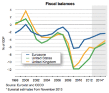 When it comes to fiscal policies, 12 percent of the US federal budget is used for transfers to states and local governments. Also, when a state has financial or economic difficulties, a fair amount of money is automatically transferred to the state. The US government does not impose restrictions on state budget policies. This is different from the fiscal policies of the eurozone, where Treaty of Maastricht requires each eurozone member country to run its budget deficit smaller than 3 percent of its GDP.[72]