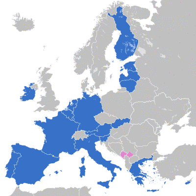 The eurozone consists of Austria, Belgium, Cyprus, Estonia, Finland, France, Germany, Greece, Ireland, Italy, Latvia, Lithuania, Luxembourg, Malta, the Netherlands, Portugal, Slovakia, Slovenia, and Spain. Other EU states (except for Denmark) are obliged to join once they meet the criteria to do so.[8] No state has left, and there are no provisions to do so or to be expelled.[9] Andorra, Monaco, San Marino, and Vatican City have formal agreements with the EU to use the euro as their official currency and issue their own coins.[10][11][12] Kosovo and Montenegro have adopted the euro unilaterally,[13] but these countries do not officially form part of the eurozone and do not have representation in the European Central Bank (ECB) or in the Eurogroup.[14]