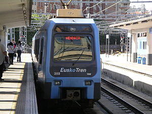 Euskotren Trena, formerly known just as Euskotren is a commuter, inter-city and urban transit train-operating company that operates local and inter-city passenger services in the provinces of Biscay and Gipuzkoa, in the Basque Country, Spain. It is one of the four commercial brands under which Basque Railways operates, as a public company managed by the Basque government. The entire 181.1-kilometre (112.5 mi) network[2] uses 1,000 mm (3 ft 3 3&fras1;8 in) narrow gauge rail tracks which have been owned by the Basque Government since their transferral from the Spanish government; the rail tracks and stations were part of the FEVE network until its transferral. Euskotren Trena also operates the Donostia/San Sebastián metro under the brand Metro Donostialdea.