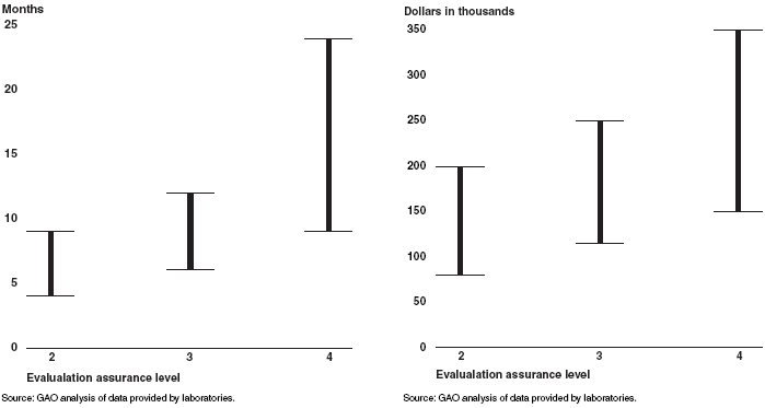In 2006, the US Government Accountability Office published a report on Common Criteria evaluations that summarized a range of costs and schedules reported for evaluations performed at levels EAL2 through EAL4.