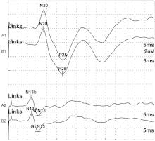 The two most looked at aspects of an SSEP are the amplitude and latency of the peaks. The most predominant peaks have been studied and named in labs. Each peak is given a letter and a number in its name. For example, N20 refers to a negative peak (N) at 20ms. This peak is recorded from the cortex when the median nerve is stimulated. It most likely corresponds to the signal reaching the somatosensory cortex. When used in intraoperative monitoring, the latency and amplitude of the peak relative to the patient's post-intubation baseline is a crucial piece of information. Dramatic increases in latency or decreases in amplitude are indicators of neurological dysfunction.