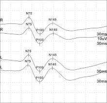 The P100 component of VEP response, which is the positive peak with the delay about 100 ms, has a major clinical importance. The visual pathway dysfunction anterior to the optic chiasm maybe where VEPs are most useful. For example, patients with acute severe optic neuritis often lose the P100 response or have highly attenuated responses. Clinical recovery and visual improvement come with P100 restoration but with an abnormal increased latency that continues indefinitely, and hence, it maybe useful as an indicator of previous or subclinical optic neuritis.[29]
