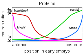 Such a cascading regulatory network has been studied in detail in the development of the fruit fly embryo. The young embryo is oval in shape, like a rugby ball. A small number of genes produce messenger RNAs that set up concentration gradients along the long axis of the embryo. In the early embryo, the bicoid and hunchback genes are at high concentration near the anterior end, and give pattern to the future head and thorax; the caudal and nanos genes are at high concentration near the posterior end, and give pattern to the hindmost abdominal segments. The effects of these genes interact; for instance, the Bicoid protein blocks the translation of caudal's messenger RNA, so the Caudal protein concentration becomes low at the anterior end. Caudal later switches on genes which create the fly's hindmost segments, but only at the posterior end where it is most concentrated.[49][50]