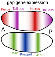 - ^ a b Rivera-Pomar, Rolando; Jackle, Herbert (1996). "From gradients to stripes in Drosophila embryogenesis: Filling in the gaps". Trends in Genetics. 12 (11): 478–483. doi:10.1016/0168-9525(96)10044-5. PMID 8973159.