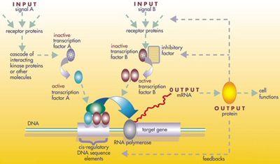 In 1961, Jacques Monod, Jean-Pierre Changeux and François Jacob discovered the lac operon in the bacterium Escherichia coli. It was a cluster of genes, arranged in a feedback control loop so that its products would only be made when "switched on" by an environmental stimulus. One of these products was an enzyme that splits a sugar, lactose; and lactose itself was the stimulus that switched the genes on. This was a revelation, as it showed for the first time that genes, even in an organism as small as a bacterium, were subject to fine-grained control. The implication was that many other genes were also elaborately regulated.[23]