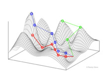 An evolutionary landscape is a metaphor[1] or a construct used to think about and visualize the processes of evolution (e.g. natural selection and genetic drift) acting on a biological entity[2] (e.g. a gene, protein, population, or species).[3] This entity can be viewed as searching or moving through a search space. For example, the search space of a gene would be all possible nucleotide sequences. The search space is only part of an evolutionary landscape. The final component is the "y-axis", which is usually fitness. Each value along the search space can result in a high or low fitness for the entity.[1] If small movements through search space cause changes in fitness that are relatively small, then the landscape is considered smooth. Smooth landscapes happen when most fixed mutations have little to no effect on fitness, which is what one would expect with the neutral theory of molecular evolution. In contrast, if small movements result in large changes in fitness, then the landscape is said to be rugged.[1] In either case, movement tends to be toward areas of higher fitness, though usually not the global optima.