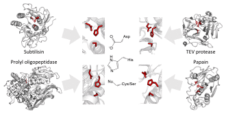 - ^ a b c d Buller, A. R.; Townsend, C. A. (19 Feb 2013). "Intrinsic evolutionary constraints on protease structure, enzyme acylation, and the identity of the catalytic triad". Proceedings of the National Academy of Sciences of the United States of America. 110 (8): E653–61. Bibcode:2013PNAS..110E.653B. doi:10.1073/pnas.1221050110. PMC 3581919. PMID 23382230.