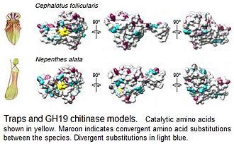 Carnivory has evolved multiple times independently in plants in widely separated groups. In three species studied, Cephalotus follicularis, Nepenthes alata and Sarracenia purpurea, there has been convergence at the molecular level. Carnivorous plants secrete enzymes into the digestive fluid they produce. By studying phosphatase, glycoside hydrolase, glucanase, RNAse and chitinase enzymes as well as a pathogenesis-related protein and a thaumatin-related protein, the authors found many convergent amino acid substitutions. These changes were not at the enzymes' catalytic sites, but rather on the exposed surfaces of the proteins, where they might interact with other components of the cell or the digestive fluid. The authors also found that homologous genes in the non-carnivorous plant Arabidopsis thaliana tend to have their expression increased when the plant is stressed, leading the authors to suggest that stress-responsive proteins have often been co-opted[c] in the repeated evolution of carnivory.[58]