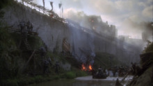 Arthur and Mordred's forces meet in battle. The fog from the dragon's breath shrouds Arthur's cavalry charge against Mordred's battle line, lending Arthur's depleted force the element of surprise against their more numerous foes. Lancelot arrives unexpectedly, tearing through Mordred's troops with savage fury and turning the tide of battle, but later collapses from his unhealed self-inflicted wound. Arthur and Lancelot reconcile, and Lancelot dies. Mordred stabs Arthur with a spear, but Arthur kills Mordred with Excalibur. Arthur tells Perceval to throw Excalibur into a pool of water, reassuring him that a new king will come, and the sword will return. Perceval throws Excalibur, and the Lady of the Lake catches it. Perceval returns to see Arthur lying on a ship attended by three ladies clad in white, sailing towards Avalon.