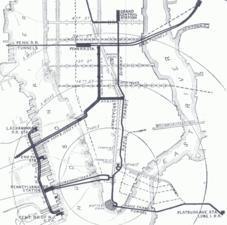 As early as July 1764[1] a ferry began operating from Paulus Hook to the foot of Courtland Street (where Cortland Street Ferry Depot would be built).[2] The first steam ferry service in the world began between Paulus Hook and Manhattan in 1812,[3] and the New Jersey Rail Road and Transportation Company opened a rail line from Newark to Paulus Hook, then part of the newly incorporated City of Jersey, in 1834.[4] The PRR acquired the railroad in 1871 and replaced the terminal in 1876 and yet again in 1888-1892.[5] Competition along the Northeast Corridor between New York City, Philadelphia, Baltimore and Washington, principally between the PRR and Baltimore and Ohio Railroad, was fierce. These railroads both used terminals in Jersey City, there being no tunnels or bridges to Manhattan, and for much of the 19th century, Exchange Place was one of the busiest rail stations in the world.