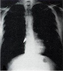 X-ray showing a bullet (white spot) in the heart
