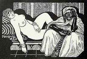 Édouard Manet’s Olympia, finished in 1863, was based on Titian’s Venus of Urbino.[8] Olympia was a popular play about a courtesan called Olympia. This subject was extremely controversial for an artist to portray a woman like this because of traditional vision of the Academy. Manet was being very different from the accepted academic style by outlining and flattening space that created a distortion of classical elements. Olympia is provocative in her nudity that implies she is naked, not nude.[9] She is looking out in a very confrontational way, and setting the viewer as a man coming to the prostitute, although Olympia’s hand suggests she is not ready to engage with the customer.[10] The African servant calls on racism and slavery in France, because showing someone of color participating in French life was unheard of, furthering the work's exotic nature.